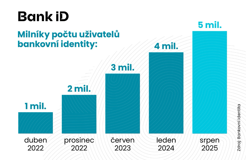 Bankovní identita (Bank iD) je nejpoužívanější metodou digitálního ověření totožnosti, kterou u služeb státu a firem využilo už pět milionů českých občanů.Ještě v červnu 2023 činil počet uživatelů tři miliony, čtyřmilionová hranice padla v lednu 2024. Lidé začali používat bankovní identitu v lednu 2021.